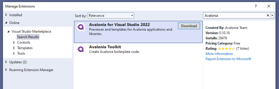 Для поддержки Avalonia, необходимо установить расширение Avalonia для Visual Studio.